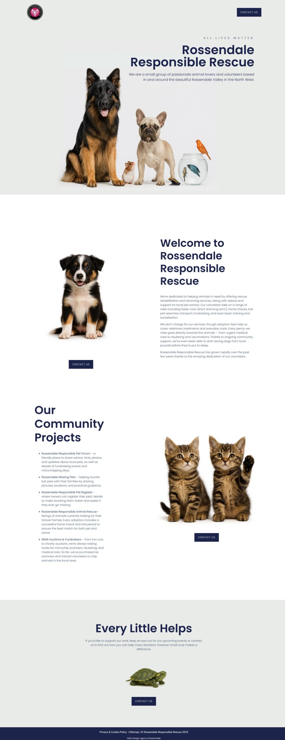 The new Rossendale Responsible Rescue website is clean, modern, and easy to use. It uses large images, bold headings, and plenty of white space to make the content feel calm and professional. The layout guides visitors naturally through each section, and the design works perfectly on all devices. This new site was built in Elementor and fully custom-designed — not from a template.